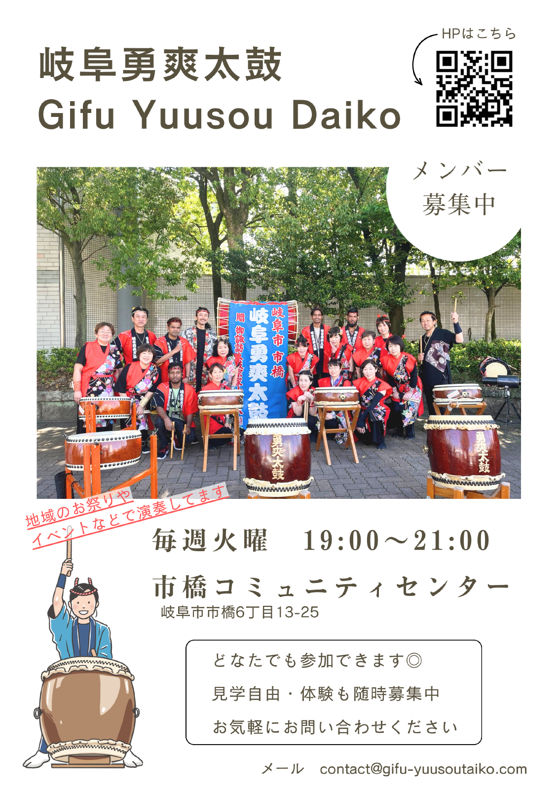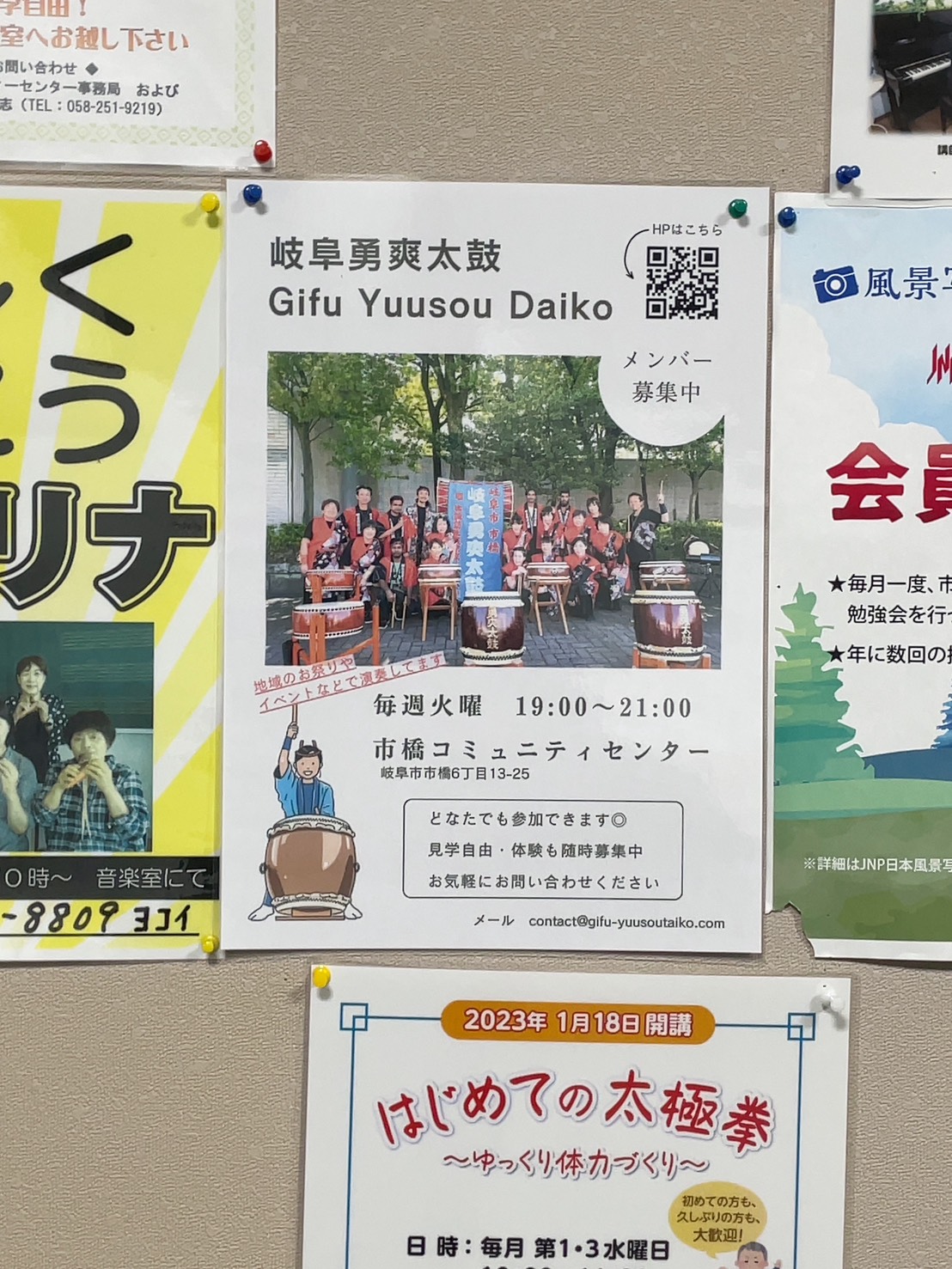 2026年3月 岐阜勇爽太鼓のポスターを新しくしました。市橋コミセンに掲示してあります。